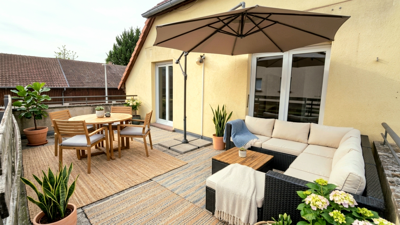 - Une cuisine équipée (plaque de cuisson, four, hotte, emplacements lave-vaisselle et micro-ondes) sur plus de 15m² utiles et avec accès direct à la terrasse.