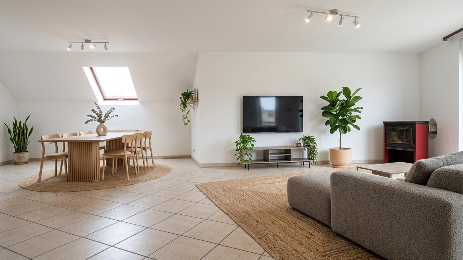 - Un vaste séjour de 40m² habitables équipé d’un poêle à bois et permettant également l’accès à la terrasse.