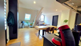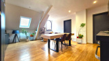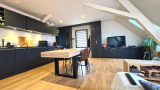 - Une cuisine entièrement équipée (plaque, four, hotte, lave-vaisselle, emplacement frigo) ouverte sur un séjour spacieux avec poutres apparentes, le tout sur près de 24m².
