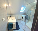 - Une salle de bain équipée d’une douche, d’un meuble vasque, et emplacement machine à laver.