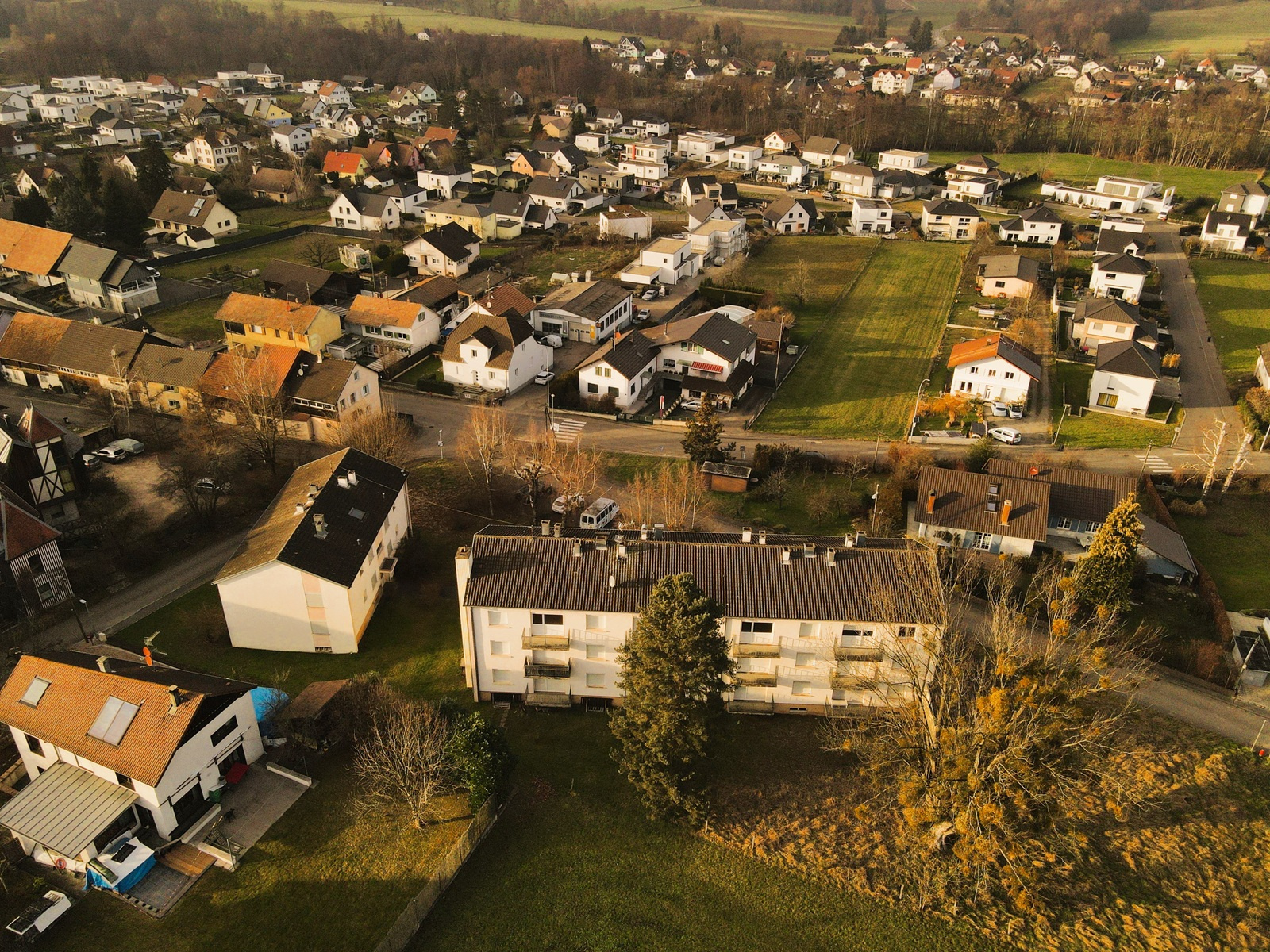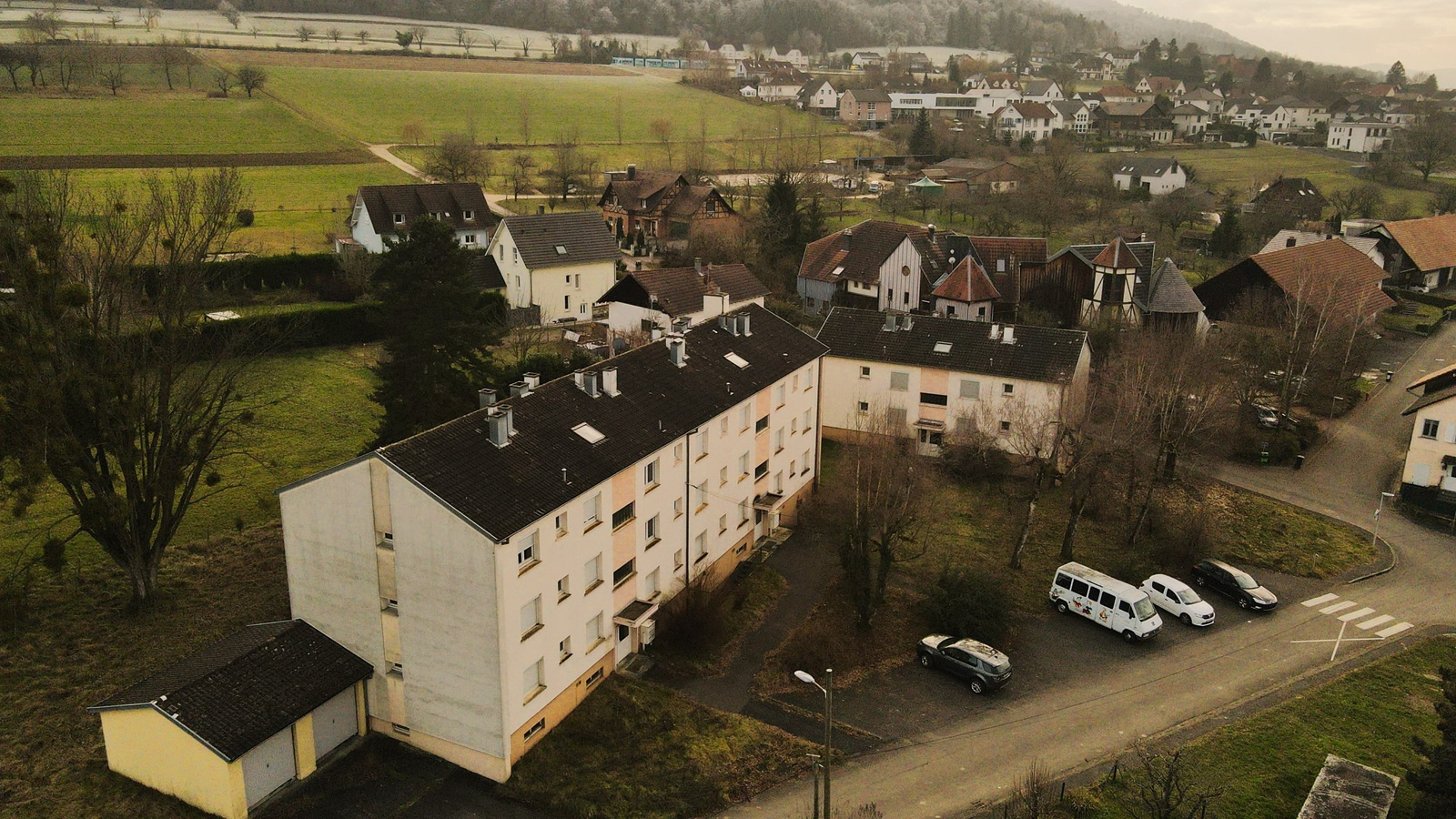 - Dans le grand immeuble, 12 logements (trois F4 de 75m², six F3 de 65m², et trois F2 de 50m²)